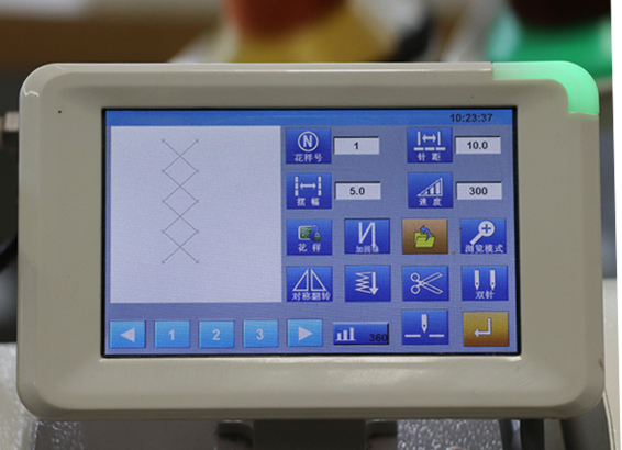 此壓線機采用志強公司自主研發操作軟件,通過針桿旋轉技術來實現不同花樣,包括T字型,X型,口字型等298種裝飾花樣。經過家具制造商改良,在對沙發和汽車座套的轉角進行壓明線作業時也能確保縫紉速度和漂亮的線跡。本機采用杜克普(DURKOPPADLER)204款超大半回轉型擺梭,增加容線量,減少換線次數,提高工作效率。能使用極粗線(1500dx3,V415,V462,T-500或1.4mm空心線,扁線或裝飾線),是高檔沙發和汽車座套生產廠家不可或缺的花樣裝飾縫紉設備。超強的垂直機針穿透力、特殊改型壓腳及線跡調節裝置,確保在縫紉交叉接縫時保持統一,避免拋線,浮線,縮針距,跳針和線疙瘩等瑕疵,使用極粗線對沙發套或汽車坐套進行壓明線作業時,其優勢更加明顯。
